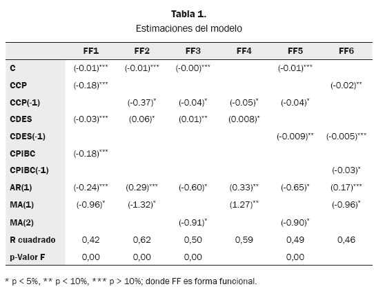 Se espera que la relación entre el ciclo del consumo privado y la prima por riesgo sea negativa, ya que cuando se presentan expansiones en la economía el consumo es elevado, lo que permite requerir un menor rendimiento. Por el lado del desempleo la relación deberá ser positiva, pues un desempleo elevado implica que en general los agentes requieran tasas de retorno más elevadas para sustituir consumo por inversión, por lo que la prima por riesgo aumenta. Con respecto al PIB, las recesiones deberían generar un mayor rendimiento requerido y las expansiones uno menor, por lo cual se espera también una relación inversa. Frente a la variable autorregresiva AR (1) su signo no es claro de forma a priori, ya que los cambios en la prima por riesgo podrían trasladarse al periodo siguiente o no, dependiendo de la coyuntura. Lo que sí debe plantearse sin temor a equivocaciones es que su valor debe ser inferior a la unidad, pues como se advirtió anteriormente, las series son integradas de orden cero. Finalmente, en lo concerniente al proceso MA (1), su carácter aleatorio impide conocer ex ante su signo.