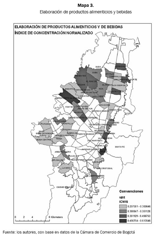 El mapa 3 reseña las 41 UPZ que cumplen los criterios en el sector de elaboración de productos alimenticios y bebidas. Para este sector se encuentra un gran DPL en Engativá, que se extiende hasta Suba, Fontibón y Usaquén. Dentro de él se encuentra que la UPZ Aeropuerto El Dorado tiene un ICN más alto, seguido de las UPZ Tibabuyes y El Rincón en Suba y Bolivia en Engativá. Puede aparecer un incipiente DPL potencial en Kennedy y Bosa, ya que registran ICN entre 0,25 y 0,35.