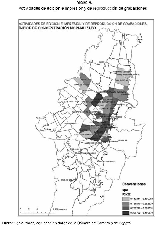 En el mapa 4 se muestra el sector de actividades de edición e impresión y reproducción de grabaciones, que cuenta con 28 UPZ bajos los criterios de DPL potencial; es visible en él que existe continuidad desde el primer anillo, el centro de la ciudad, que se encuentra entre Usaquén, Chapinero, Teusaquillo, Puente Aranda, Los Mártires, Santafé y Candelaria. Es notable que el ICN tiene más intensidad de sur (Los Mártires) a norte (Las Ferias).