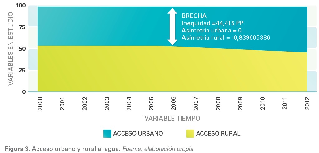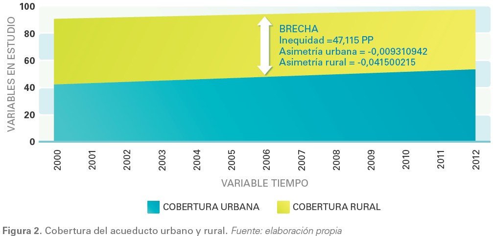 La cobertura rural presenta una brecha del orden de 47,115 (PP) frente a la cobertura urbana. El interés político de los Gobiernos por satisfacer a las poblaciones urbanas ha llevado a que la prestación del servicio sea asimétrico (-0,009310942) donde el 74,40 % de la población se concentra en torno a la media de distribución. Para el caso del contexto rural, la cobertura presenta una asimetría igualmente negativa (-0,839605386), pero allí 40,65 % de la población pobre tiene dificultades para acceder al recurso agua.