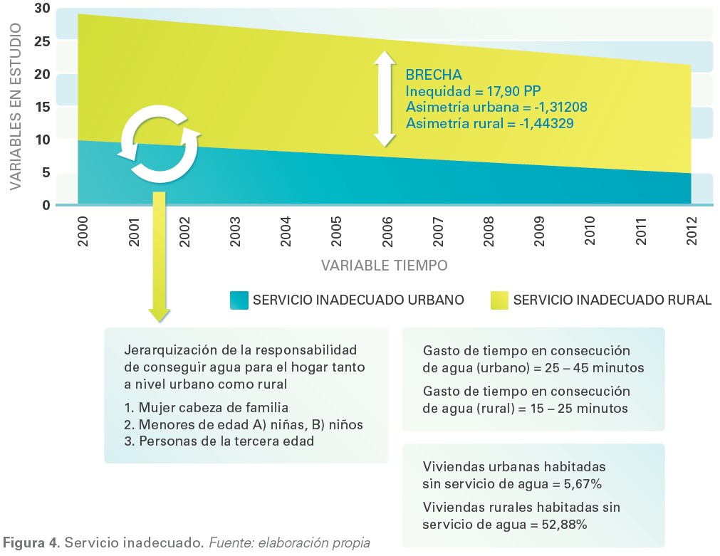 Estos grupos de personas urbanas o rurales que deben satisfacer su necesidad hídrica de manera autónoma por falta del servicio en sus hogares afrontan situaciones de pobreza más difíciles de superar debido a la necesidad de invertir algún tiempo diario en la consecución del agua, mediante una distribución del trabajo de tipo marginal (PNUD, 2006; Banco Mundial, 2010; Cepal, 2011) (ver figura 4).
