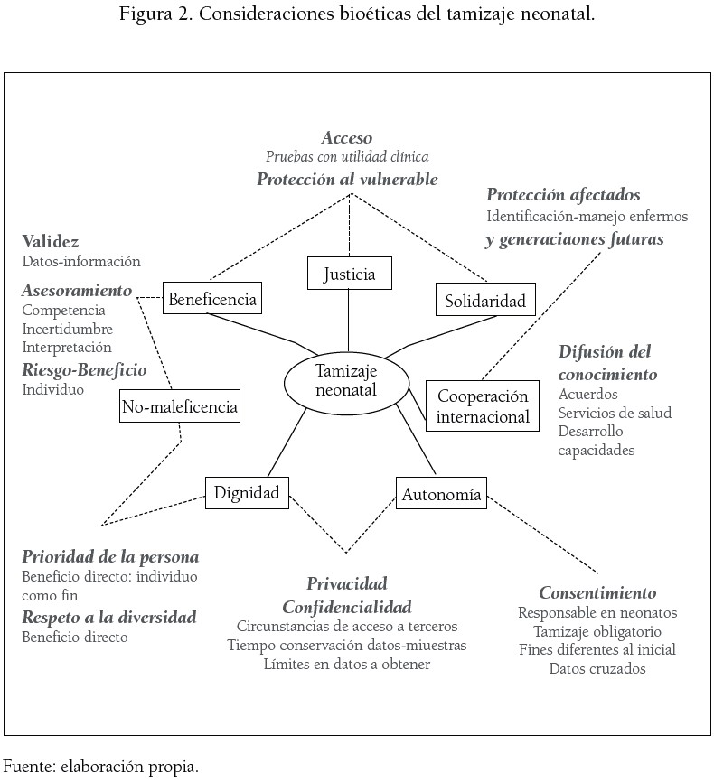Otra consideración bioética es la posibilidad de acceso a pruebas genético- moleculares del tamizaje neonatal con validez y utilidad clínica. En este caso, la mayor preocupación ha sido asegurar la atención médica (Burke et al., 2001), es decir la protección de los afectados bajo el principio de solidaridad. Sin embargo, hay diferencias en el acceso; para citar un ejemplo, mientras algunos países tamizan pocas enfermedades otros lo hacen en el orden de docenas (Elliman, 2012), lo cual justifica su análisis en el contexto de la difusión del conocimiento, consideración relacionada con el principio bioético de cooperación internacional.