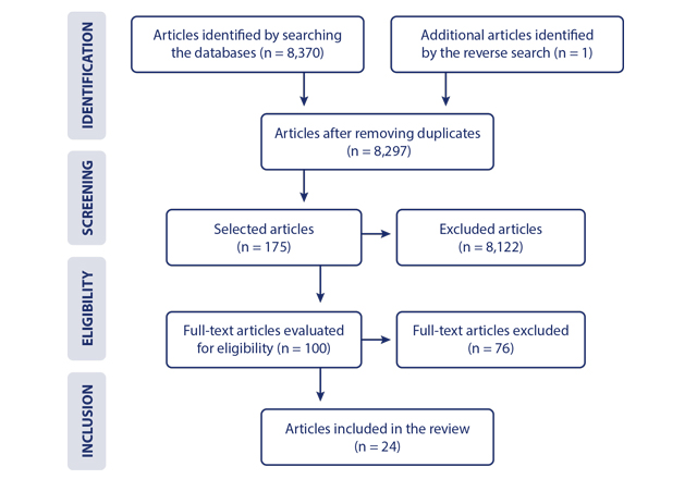 The search stage in databases and Google® scholar resulted in a total of 8,371 identified articles. After applying the inclusion and exclusion criteria, 23 were selected. In a similar search in references, one article was included. Thus, 24 studies made up the final sample, according to the flowchart shown in Figure 1.