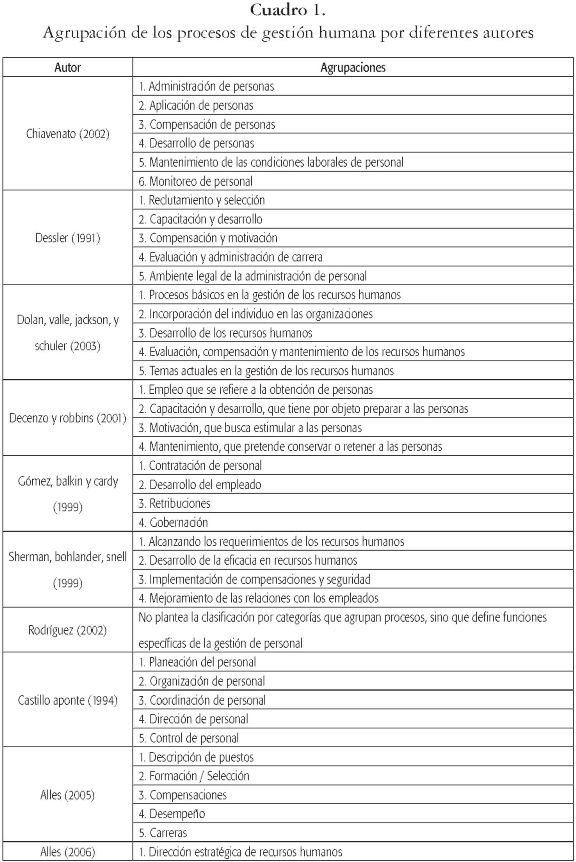 Los procesos en gestión humana tienen diferentes maneras de agruparse de acuerdo con la presentación y relación que tengan entre sí o el significado que representen para cada autor. Chiavenato (2002) los agrupa en seis partes que son susceptibles de aplicación en cualquier tipo de organización. Dessler (1991), los agrupa en cinco componentes o categorías, al igual que Dolan, Valle, Jackson y Schuler (2003). Por su parte, Decenzo y Robbins (2001) proponen un enfoque que comprende cuatro funciones básicas, mientras que Gómez, Balkin y Cardy (1999), al igual que Sherman, Bohlander, Snell (1999), proponen un enfoque que comprende 4 partes. Rodríguez (2002), a diferencia de los autores citados, no plantea una clasificación por categorías que agrupan procesos, sino que sólo define funciones específicas de la gestión de personal. Estas agrupaciones pueden observarse en el Cuadro 1.