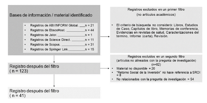 Precisado que se trata de una Revisión Sistemática, la cual se construye partiendo de cuestionamientos tales como ¿contribuye la utilización del indicador SROI con la gestión eficiente de los recursos?, los parámetros de búsqueda que se definieron fueron los siguientes: i) Social Return on Investment, ii) SROI y iii) Retorno Social de la Inversión. Estos términos fueron consultados en las bases de datos académicas EbscoHost, Scopus, Science Direct, SpringerLink, JSTOR y Abi/Infor Collection (Proquest). Es conveniente subrayar que solo se trabajó con investigaciones académicas publicadas entre 20042 y 2021.