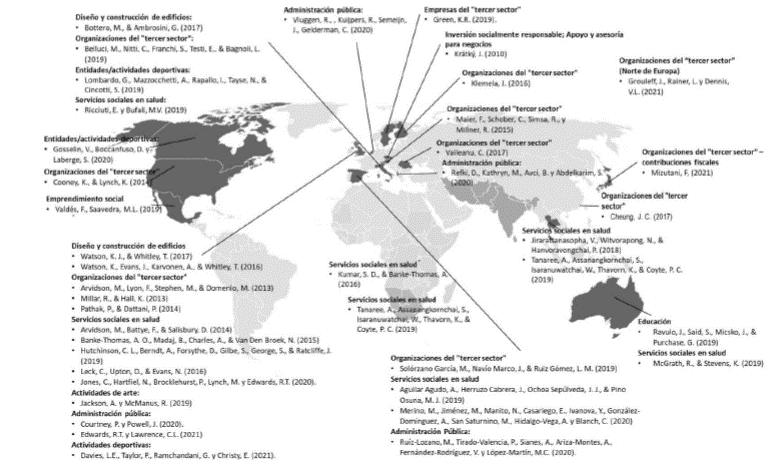 A lo largo del presente análisis se evidenció una tendencia a aplicar la metodología SROI en el sector salud (denominado por diferentes autores como "servicios sociales en salud") y en entidades sin ánimo de lucro o tercer sector, puesto que doce (y trece artículos, respectivamente, discutían sobre la necesidad de encontrar en los proyectos gestados la forma de justificar, en términos monetarios, los impactos que estos proyectos representaban para las diferentes organizaciones. Es importante resaltar, cuando se habla del "tercer sector", que las organizaciones pertenecientes a este grupo se consolidan una vez se crean espacios para construir perspectivas compartidas y unir esfuerzos en una causa en particular, dado que estos artículos contienen discusiones vinculantes y sus reflexiones aluden a múltiples líneas, áreas, sectores; en los que se crea una convergencia entre los diferentes esfuerzos de medición de la rentabilidad social.