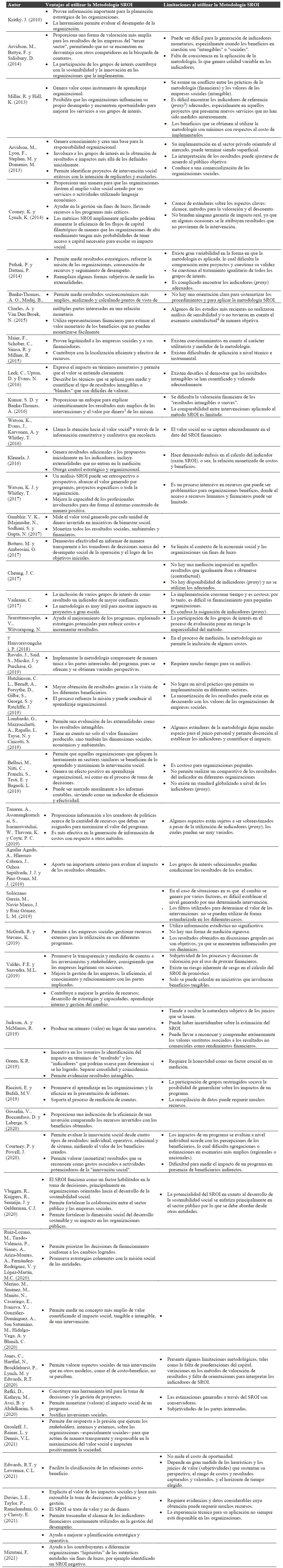 A lo largo de esta revisión documental los autores concluyen que la metodología SROI se convierte en un medio para analizar y expresar el valor de una intervención en términos monetarios, tomando como base tanto aspectos cualitativos como cuantitativos. En este proceso de conversión es necesario tener en cuenta la impresión o experiencia de aquellos que lideran las intervenciones, así como los demás actores o grupos de interesados que participan o se ven afectados por su ejecución.