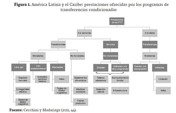 Uno de los elementos que componen los programas de asistencia social en América Latina y el Caribe corresponde a los Programas de Transferencias Condicionadas (PTC). Cecchini y Madariaga (2011) brindan una clasificación conceptual y metodológica para este tipo de programas (Figura 1), a los cuales dividen en dos grandes clases: beneficios asociados a las familias (demanda) y beneficios asociados a los proveedores de servicios (oferta). En el primer ramo se distinguen tres tipos de prestaciones: transferencias monetarias, no-monetarias y servicios; y en el segundo predominan las transferencias de tipo monetario. En las siguientes subsecciones se expondrán brevemente estas prestaciones. Es necesario tener presente que Colombia usa programas de transferencias condicionadas del lado de la demanda.