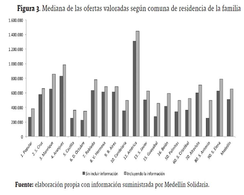 Si se discrimina el valor de las ofertas a nivel de comuna, también aparecen marcadas diferencias (Figura 3)5. Sin incluir el acceso a la información, anualmente ocho comunas, entre ellas dos rurales, presentan valores medios superiores al salario mínimo mensual legal vigente en 2011 ($535.600). Cuando se incluye el valor de acceso a la información, se eleva a diez el número de comunas que superan el umbral mínimo de salarios; es decir, aparte de Aranjuez $986.223, Manrique $851.530, Santa Elena $783.642, Robledo $777.095, Altavista $706.212, Buenos Aires $681.714, Villa Hermosa $681.714 y Santa Cruz $657.771, aparecen por encima de dicho umbral San Javier $627.171 y Belén $591.785.