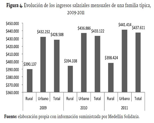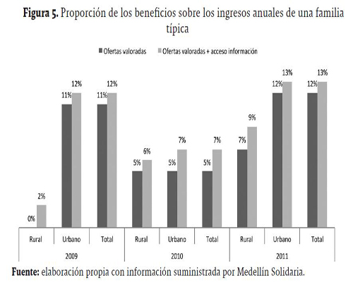 En 2010, tanto las familias rurales como urbanas de Medellín Solidaria lograron incrementar sus ingresos en 5%. Sin embargo, si se tiene en cuenta el acceso a la información, el incremento para los primeros fue del 6%, mientras que para los segundos fue del 7%. En general, gracias al acceso a los programas que promueve Medellín Solidaria, el hogar típico en Medellín (tanto urbano como rural) aumentó sus ingresos en un 5%, sin contar el acceso a la información, y en un 7%, teniendo en cuenta dicho acceso. Para el año 2011, las familias rurales, sin acceso a la información, incrementaron sus ingresos en un 7%, mientras que con acceso a la información este porcentaje fue del 9%. Por su parte, las familias urbanas aumentaron sus ingresos en un 12% para el primer caso y en un 13% para el segundo. En términos totales, el hogar típico de Medellín, sin acceso y con acceso a información, logró aumentar sus ingresos en un 12% y 13%, respectivamente.