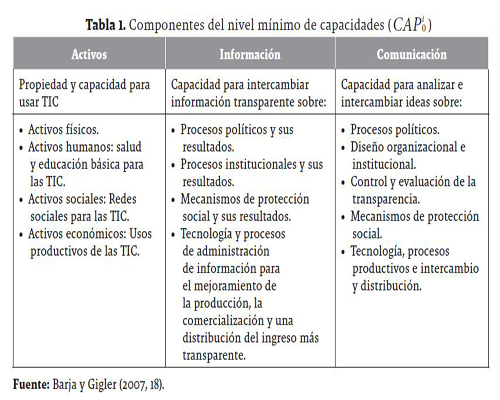 De acuerdo con lo anterior, el ICPj será la distancia entre el nivel mínimo de capacidades necesario para participar en una sociedad y el nivel observado de capacidades de cada localidad j. Los autores argumentan que el CAP0i está compuesto por tres componentes fundamentales: (1) los activos, relacionados con la propiedad y capacidad para usar tecnologías de información y comunicación; (2) información y (3) las comunicaciones; donde la primera indica la capacidad para intercambiar información y la segunda la capacidad para analizar e intercambiar ideas. Un resumen de estos componentes se encuentra en la Tabla 1.