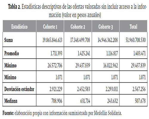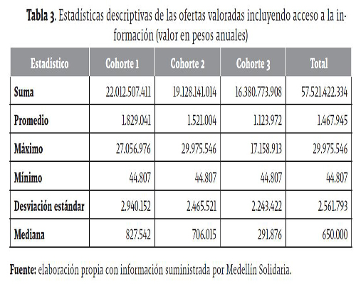 Cuando se incluye el acceso a la información como un componente adicional al valor del bien y servicio en consideración, claramente, el valor medio se incrementa (Tabla 3). En términos globales, el valor medio aumentó en un 28%, en comparación con la valoración de la oferta sin tener en cuenta el valor agregado del programa Medellín Solidaria. Por zonas, el beneficio medio fue de $654.243 anual en la zona urbana, en tanto que en la zona rural se ubicó en $594.376 anual; en términos globales, el valor de la mediana fue de $650.000 anual.