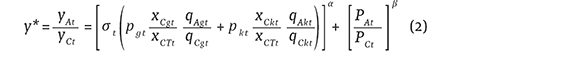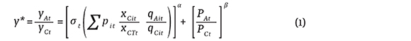 Siendo σt la tasa de cambio; xCTt, los ingresos generados por las exportaciones colombianas; xCit, los ingresos generados por las exportaciones del producto i; qAit, la producción del bien i en Antioquia; y qCit, la producción del bien i en Colombia. El valor pit sería el precio internacional del bien i; PAt, la población de Antioquia; y PCt, la población colombiana. Todo esto para el período t.