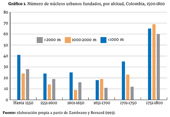 La concentración en los Andes habría estado intensificada, según autores como Kalmanovitz (2006), por la tendencia a lo largo del período colonial a poblar las tierras con altitudes mayores de 1.000 metros sobre el nivel del mar, donde dejaban de proliferar los mosquitos y las fiebres maláricas que portaban. No obstante, en los datos esto solo logra identificarse en la última parte del siglo XVIII. De hecho, poco parece haber tenido que ver la altitud de los territorios en el establecimiento de los poblados durante la Colonia y su particular concentración en el centro del país. En el gráfico 1 es posible observar la predominancia de las zonas a menos de 1.000 metros de altura sobre el nivel del mar en la fundación de núcleos urbanos. Entre los años 1500 y 1800 solo 28,5% de los núcleos urbanos fundados (entre ciudades, villas, parroquias, lugares y pueblos indígenas) se ubicaban a más de 2.000 metros sobre el nivel del mar. Mientras tanto, los poblados ubicados a menos de 1.000 metros de altura representaban poco más de 40,5%. Así, la densificación progresiva del eje norte-sur que representaba los Andes parece haber estado más relacionada a la persistencia de los primeros poblados (relacionados a su vez con los poblados prehispánicos) que a las preferencias de los españoles por tierras más altas.