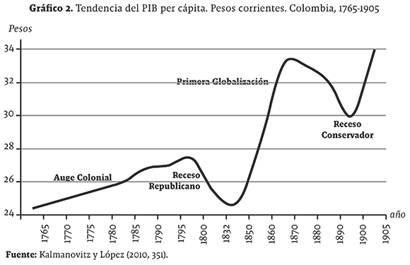 El gráfico 2 muestra la dinámica del PIB per cápita estimado por Kalmanovitz y López (2010). Sus estimaciones indican un crecimiento sostenido en la última parte del siglo XVIII, que se ve interrumpido por una fuerte recesión luego de la Independencia, la cual perdura hasta mediados del siglo XIX. El período liberal y la primera inserción del país a la economía mundial habrían traído niveles de crecimiento excepcionales hasta la década de 1870, siguiendo un período de recesión que llegaría hasta los primeros años del siglo XX.