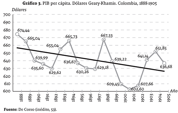 En términos generales, los cálculos de De Corso coinciden con la tendencia de Kalmanovitz y López (2010), pudiéndose observar una fuerte caída del ingreso per cápita a lo largo del período (gráfico 3), que toca fondo en 1901, durante la Guerra de los Mil Días, para comenzar a recuperarse lentamente a partir de 1902. Por otra parte, De Corso especula sobre la posibilidad de que el PIB per cápita haya alcanzado cómodamente los 700-750 dólares de 1990 en el mejor momento del siglo XIX. Así, se atreve a conjeturar que las estimaciones aisladas de McGreevey -1870- y Camacho -1861- son bastante acertadas.