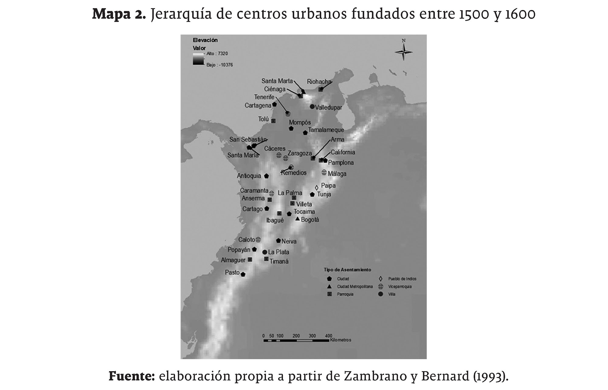Para empezar, a diferencia de lo sucedido en México y Perú, a la llegada de los españoles a Colombia no se encontró ningún poblado construido por los indígenas que fuera la base de grandes ciudades coloniales. No obstante, fue en las regiones de alta densidad poblacional indígena donde los conquistadores se asentaron predominantemente, conformando poblados con diferentes estructuras de organización, dependiendo de la composición demográfica de la zona (Kalmanovitz 2006). Así, tal como lo presenta el mapa 2, en el siglo XVI ya era clara la concentración de la población en la zona andina.