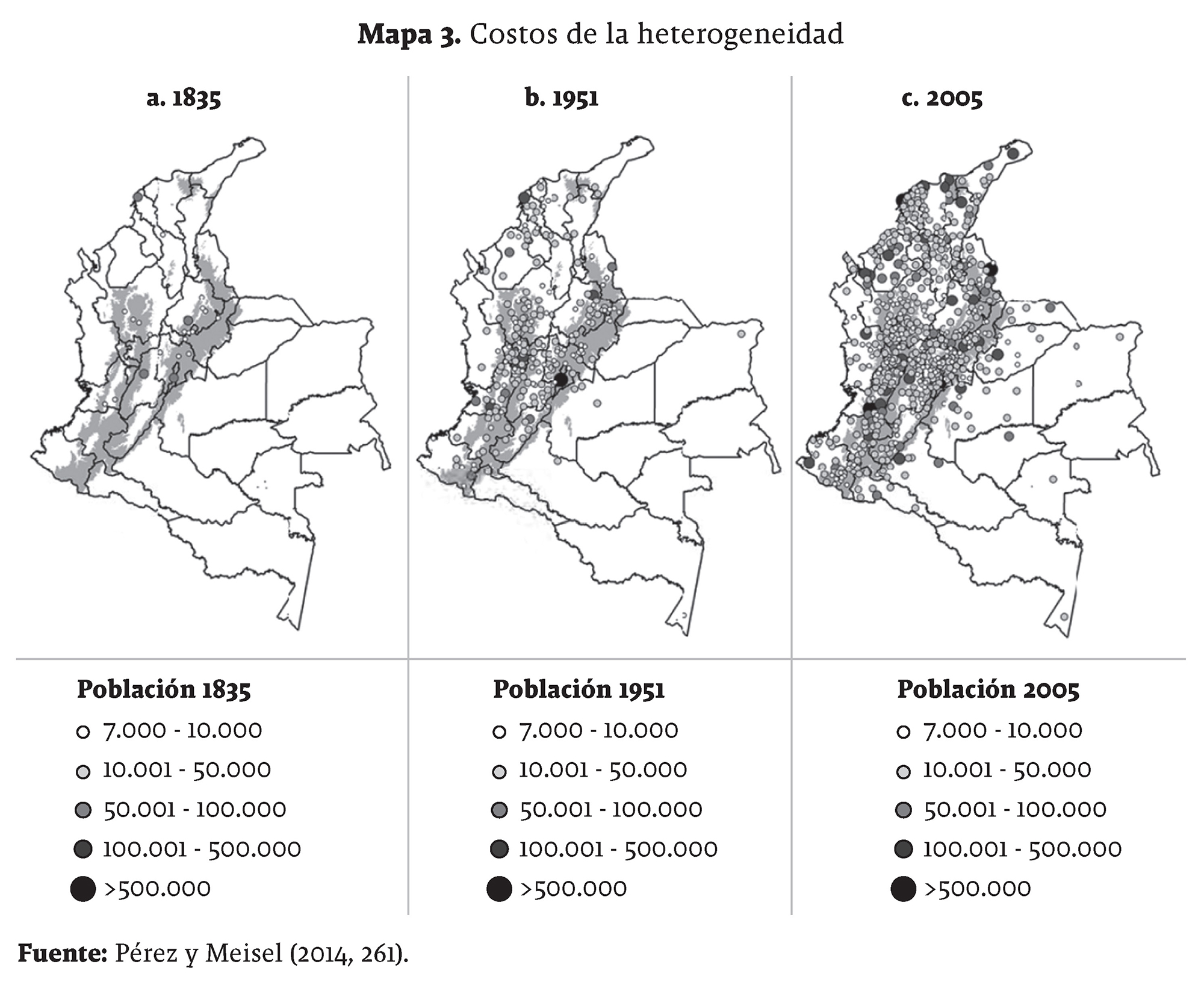 Es claro que las condiciones del territorio eran agrestes, sin embargo, fueron los rasgos de la distribución poblacional los que llevaron a que la geografía se convirtiera en un limitante para la unificación de la economía nacional. En vez de aprovechar economías de escala y evadir las complicaciones del territorio congregándose la población en unas pocas grandes ciudades en las costas, Colombia se configuró como un colectivo de pequeñas ciudades bastante dispersas sobre el centro del país. Las razones de ello tienen, en buena medida, orígenes históricos.
