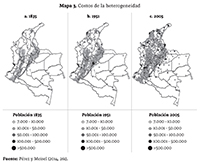 Esta tendencia se corrobora en el período siguiente. A lo largo de los siglos XIX y XX las líneas generales de poblamiento del territorio cambiaron bastante poco. Los mapas siguientes (mapa 3) evidencian cómo la población se fue expandiendo alrededor de las ciudades preexistentes en la zona Andina y la Costa Caribe.