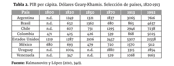 Si bien parte del ciclo identificado en estas estimaciones se debió a la coyuntura nacional, el patrón descrito es bastante parecido al del resto de países de la región durante la época. Las reformas borbónicas de finales del siglo XVIII, la Independencia, la primera globalización y las reformas centralistas de finales de siglo parecen haber sido fenómenos que impactaron de forma similar a las diferentes naciones latinoamericanas. No obstante, sí hubo diferencias en cuanto a los niveles y las tasas de crecimiento de Colombia con respecto a Latinoamérica. Colombia no solo arrancó el siglo XIX como una nación bastante pobre, además, creció bastante menos que el resto de los países de la región. Así, entró al siglo XX como uno de los países más pobres de América Latina (tabla 2).