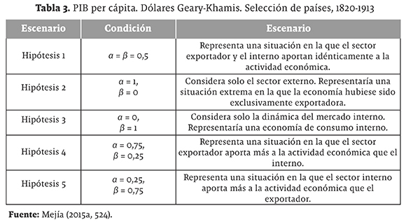 Finalmente, otro par de observaciones puntuales para la Nueva Granada están disponibles. Por un lado, McGreevey (1975) sugiere que el PIB per cápita colombiano, hacia 1870, era de 100 dólares de 1950. Este dato, cuya construcción no es muy clara, está vinculado a la información que habría recolectado sobre comercio exterior. Entre los cuestionamientos que se le hacen al trabajo de McGreevey está que sus datos de exportaciones (recolectados en los puertos de llegada, Inglaterra y Estados Unidos principalmente) incluyen la reexportación de productos desde el puerto de Panamá, por lo que, muy seguramente, esté sobreestimando el valor real del PIB. De otro lado, Salvador Camacho Roldán, un político de prestigio nacional durante la segunda mitad del siglo, tiene escritos a partir de los cuales es posible estimar, para 1861, el PIB per cápita de Colombia en 43 pesos de la época. Nuevamente, la construcción de este dato es algo oscura, pero resulta de una relación entre los ingresos de un estadounidense y un colombiano promedios, observada por Camacho Roldán y la inferencia a partir de los datos de Maddison (2009) que Robinson y García-Jimeno (2010) hacen. En la tabla 1 se resumen los detalles de estas estimaciones.
