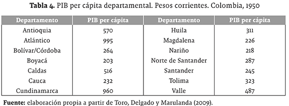 13 El ingreso promedio de los campesinos, arrendatarios, trabajadores agrícolas y sus familias, oscilaba entre 100 y 200 pesos per cápita en Antioquia, Atlántico, Bolívar, Boyacá, Cauca, Magdalena, Nariño, Norte de Santander y Santander. En Cundinamarca y Tolima, debido al cultivo del café y a la mecanización de la agricultura, el ingreso rural subía a los 200-300 pesos per cápita. El ingreso rural de Caldas, a causa de la preponderancia del café, llegaba a los 300 y 400 pesos. Finalmente, el ingreso en el Valle del Cauca sobrepasaba los 400 pesos, lo que probablemente es una situación excepcional, aun en comparación con los demás países latinoamericanos.