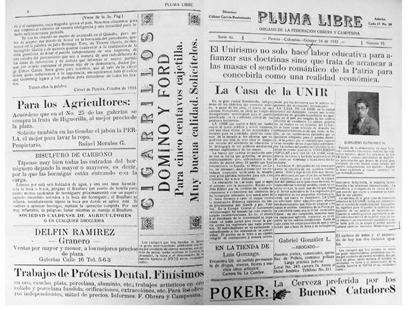 Por su parte, la primera edición de Pluma Libre apareció el 8 de julio de 1933, siendo producida en los talleres de la Imprenta Gutenberg de la ciudad de Pereira. En el subtítulo del periódico, se indicaba que este era el “Órgano de la Federación Obrera y Campesina”, es decir, se declaraba que era un medio de comunicación aparentemente adscrito a una organización sindical. Sin embargo, en un recuadro ubicado en las páginas interiores se indicaba que dicho medio “Circula como órgano del Obrerismo Independiente de Pereira” (Pluma Libre, 15 de julio de 1933, p. 3.), lo cual hace pensar que no respondía de manera específica a una organización sindical que estuviera formalmente constituida.