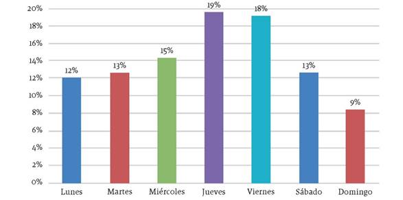 Aunque todos los meses (Figura 2) hubo publicaciones sobre corrupción, durante el período observado, el 26% de las notas salieron en marzo, siendo este el período con mayor concentración de publicaciones, seguido de febrero con 17%. En cuanto a los días de la semana (Figura 3), el 19% de las notas apareció los jueves, el 18%, los viernes y el 15%, los miércoles. La menor cantidad de notas se registró en los días domingos, con un 9%. El domingo suele ser un día de agenda informativa muy concentrada en deportes en los medios radiales. En la prensa se suele abrir espacio para contenidos de largo aliento como crónicas, informes especiales y reportajes. Que los días de la semana en los que se hable de corrupción sean días laborales y no fines de semana coincide con los géneros más utilizados para narrar la corrupción, que son las noticias escuetas (como se verá más adelante).