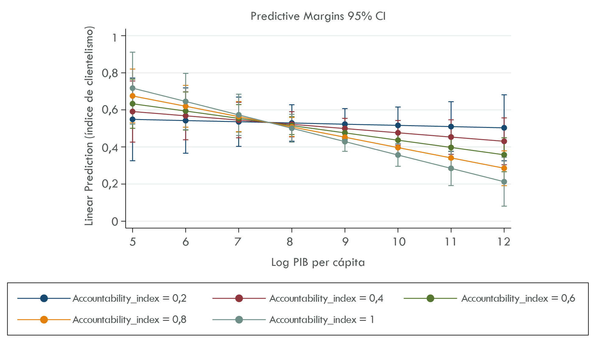 La tercera hipótesis de esta investigación plantea una relación de mediación. Para su corroboración se incluyó una interacción de las dos variables explicativas de interés, PIB per cápita y rendición de cuentas, con el propósito de determinar si la asociación del nivel de ingresos con el clientelismo depende del nivel de rendición de cuentas. En efecto, la interacción resultó estadísticamente significativa, lo cual confirma que la relación de estas variables con el fenómeno de interés sí depende una de los valores que tome la otra. Al revisar la Figura 2, se puede percibir cómo la relación inversa entre ingresos y clientelismo se hace cada vez más fuerte a medida que se incrementa el índice de rendición de cuentas.