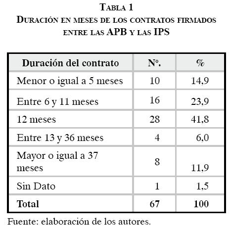 En la formalización de los contratos, la fecha de perfeccionamiento y la de inicio coincidían en el 73,2% de ellos; en el 13,4% las IPS debieron prestar servicios sin que se hubiera perfeccionado el contrato, y en el 13,4% restante la prestación se inició después de la firma. La mayoría de los contratos evaluados (65,7%) tuvieron una duración de entre seis y doce meses; en el resto de los casos la duración fue de cinco meses o menos (ver tabla 1).
