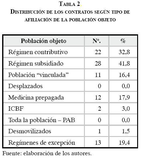 En relación con el monto de los contratos, en 40 (59,7%) de ellos éste fue igual o inferior a 100 millones de pesos; 12 (17,9%) tenían un monto de entre 101 y 1.000 millones de pesos, y en los 15 (22,3%) restantes el valor fue superior a 1.000 millones de pesos. En la distribución por tipo de afiliación de la población objeto del contrato el mayor porcentaje corresponde al subsidiado y el menor a la población no afiliada (ver tabla 2).