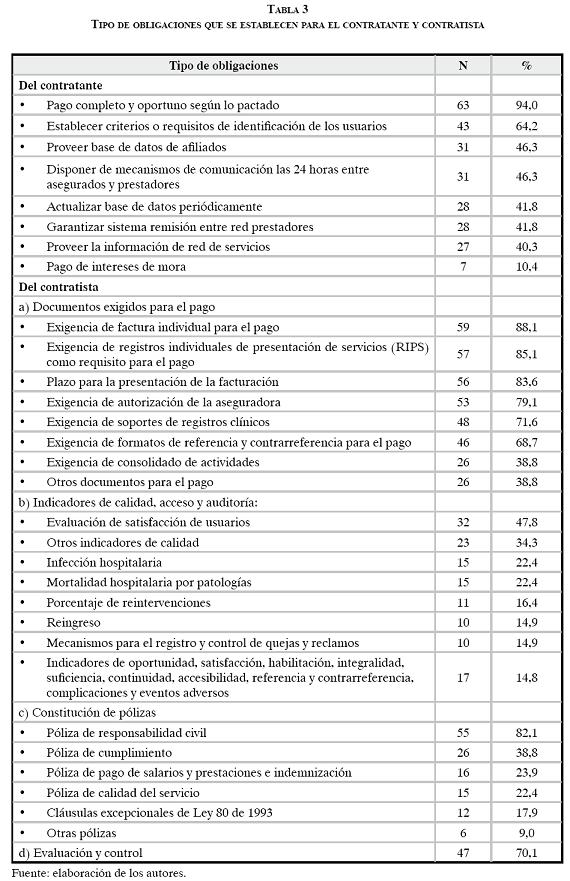En general, los contratos contemplaron varios tipos de servicios; el 79,1% de ellos incluyó servicios ambulatorios, el 67,2% servicios hospitalarios, el 65,7% servicios de urgencias, el 23,9% actividades de promoción y prevención, y el 32,8% tratamiento especializado para pacientes con patologías de alto costo. Así mismo, el 61,1% incluía servicios de laboratorio de baja y mediana complejidad, y el 44,8% laboratorio de alta complejidad; el 73,1% imagenología de baja y mediana complejidad, y el 55,2% imagenología de alta complejidad; el 67,2% incluyó cirugía. El pago de los servicios se regía por diferentes referentes de tarifas: las del ISS en el 46,3%; las del SOAT en el 32,8%; el manual de tarifas del contratista en el 23,9%, o el del contratante en un 13,4%. Con frecuencia un mismo contrato involucraba varios tipos de tarifas. En relación con las obligaciones de las partes, se observó un mayor número de obligaciones para el contratista que para el contratante, destacándose que sólo el 10,4% explicitó la obligación del contratante de pagar intereses de mora (ver tabla 3).