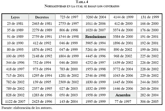 En cuanto a la normatividad que soportan los contratos, se identificaron 13 leyes, 30 decretos, 22 resoluciones, 15 de un amplio periodo de tiempo (ver tabla 4), además de 23 circulares.