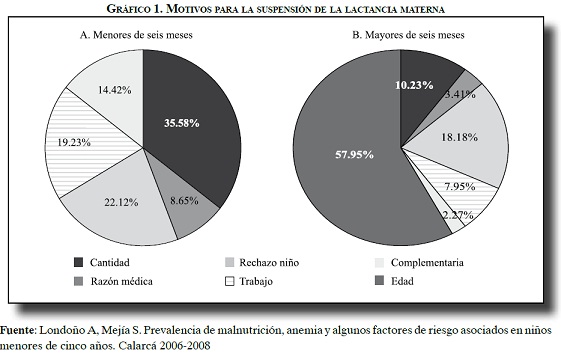 Los motivos de las madres para suspender la alimentación al seno materno fueron agrupados y se dividieron en las causas para suspensión de la lactancia como único alimento en los primeros seis meses (ver gráfico 1A) y los motivos para la suspensión definitiva después de los seis meses (ver gráfico 1B). En los primeros seis meses se encontró la mayor frecuencia de causas relacionadas con la cantidad de leche materna (35,6%). Aquí se incluyeron las respuestas: "se me secó", "era insuficiente", y "casi no me salió". Con una frecuencia de 22,1% la suspendieron porque el "niño la rechazó" o "no le gustó", y "por razones de trabajo" un 19,2%.