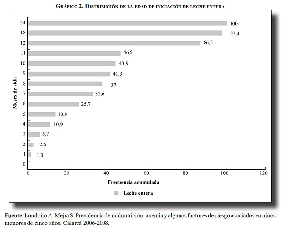 La edad promedio de inicio de la leche entera fue de 9,9 meses (IC95% 9,2-10,4), con una edad mínima de cero meses y máxima de veinticuatro. En el gráfico 2 se puede observar la frecuencia acumulada de introducción de leche entera en la alimentación del niño: al final del primer mes de vida, un 2,6%; a los cuatro meses ya se ha iniciado a un 13;9%; a los seis meses al 25,7%; a los nueve meses a un 41,3%; y a los doce meses al 86,5%.