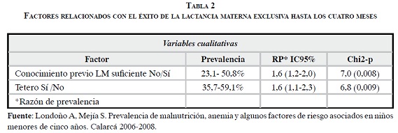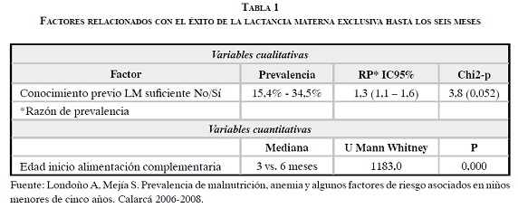 Factores relacionados con lactancia materna exclusiva e introducción temprana de leche entera en comunidades de estrato socioeconómico bajo. calarcá-colombia*