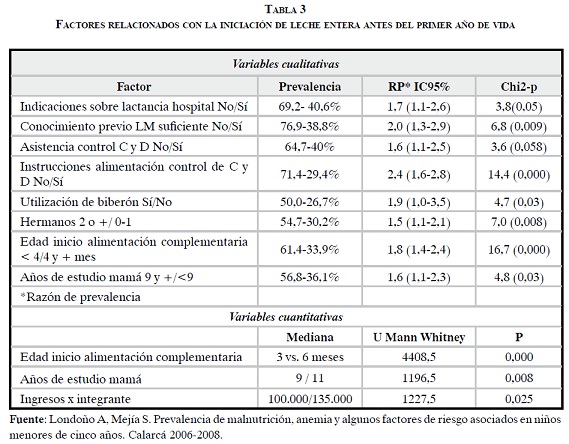 Aunque se analizaron todos los factores, y se esperaba encontrar asociación con los ingresos, lo cual no ocurrió, el número de hermanos sí puede representar un indicativo de la limitación de recursos en familias de estrato bajo. También se encontraron asociados factores relacionados con los conocimientos de las madres sobre la lactancia, lo cual se evidenció en la elevada prevalencia de inicio en el consumo de leche entera antes del primer año en niños cuyas madres tenían bajo nivel educativo o entre las que refirieron no haber recibido instrucciones sobre alimentación a pesar de tener los niños en programas de crecimiento y desarrollo.