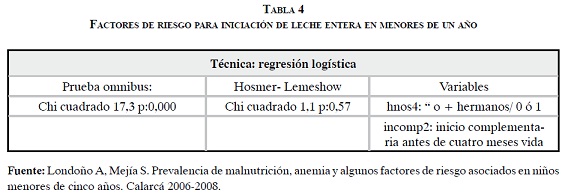 Para determinar la relación con la iniciación antes del primer año de vida se exploraron todos los factores anteriormente mencionados, y se encontraron asociados los siguientes, en orden de importancia (ver tabla 3): no recibir instrucciones sobre alimentación en el control de crecimiento y desarrollo (p: 0,000); iniciación de la alimentación complementaria antes de los cuatro meses; las indicaciones sobre lactancia antes de la salida del hospital (p: 0,05); utilización de biberón (p: 0,03); pobre nivel educativo de la mamá (p: 0,03); y tener dos o más hermanos (p: 0,008).
