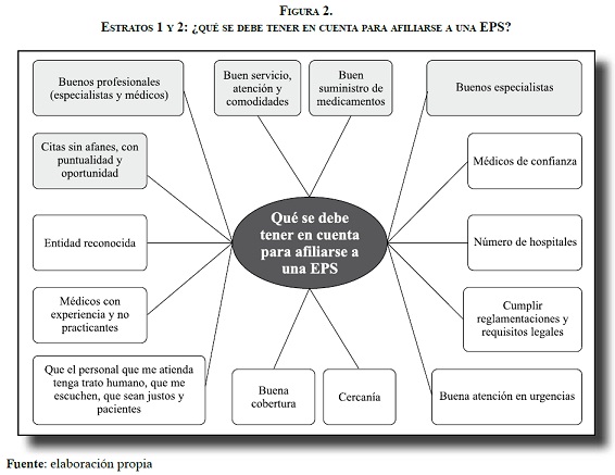 Para los estratos cuatro, cinco y seis las variables más importantes para elegir una EPS fueron: transparencia, honestidad, que cumplan lo que prometen (es frecuente la percepción de que los asesores de las EPS ofrecen cosas sólo para afiliar y luego no las cumplen, o que las EPS no dan toda la información y evaden sus responsabilidades); humanización y calidad humana en el trato (las personas esperan consideración, respeto y calidez en la atención); solidez, respaldo científico y económico, prestigio y reconocimiento de la EPS (la percepción que tenga la sociedad acerca de la EPS es importante para esta elección); la buena atención y el buen servicio (los entrevistados definieron esto como la oportunidad, la calidad, la agilidad y el conocimiento del paciente, así como unos servicios administrativos eficientes); agilidad de la atención en urgencias (en general, los afiliados perciben como traumática y demorada esta atención y esperan que al llegar a urgencias su caso sea atendido de manera inmediata); agilidad en la asignación y atención de citas médicas; calidad y cantidad de médicos y especialistas con experiencia (los entrevistados se quejan de la poca experiencia de algunos médicos que hacen la atención primaria); cobertura geográfica y cercanía a la vivienda de los centros de atención; y red prestadora con trayectoria y profesionalismo (clínicas reconocidas).