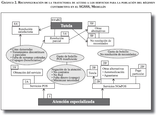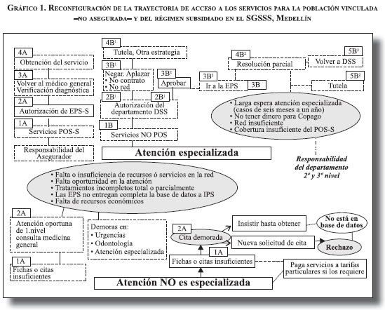 - Todo esto ha reconfigurado las trayectorias de acceso hacia la profundización de inequidades en salud, porque estas barreras afectan más a los no asegurados y a los afiliados al régimen subsidiado, los dos grupos más pobres y que menos servicios reciben, y porque la falta de dinero y de cobertura significan persistencia de desigualdades estructurales no resueltas en la construcción histórica del sistema de salud colombiano. La reconfiguración evidencia problemas transversales del SGSSS como crisis de la red pública, insuficiencia y exclusión de la focalización y del seguro subsidiado, búsqueda de rentabilidad por los aseguradores como criterio central de acceso, e insatisfacción de los usuarios con la calidad de atención.