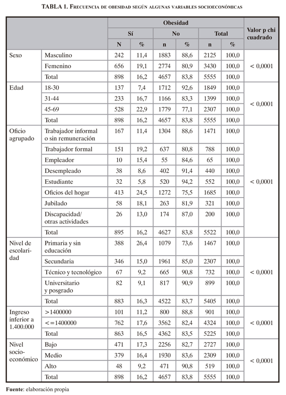 Se encontraron mayores prevalencias de obesidad en las mujeres y en la población adulta de treinta años y más. Además, se encontró evidencia de la asociación negativa entre la obesidad y el estatus socioeconómico medido por el nivel educativo, los ingresos familiares que garanticen la seguridad alimentaria, el estrato social (condiciones de la vivienda y del vecindario que se habita) y algunas ocupaciones.