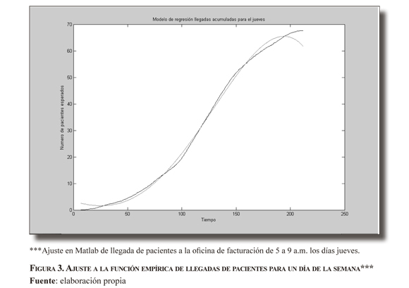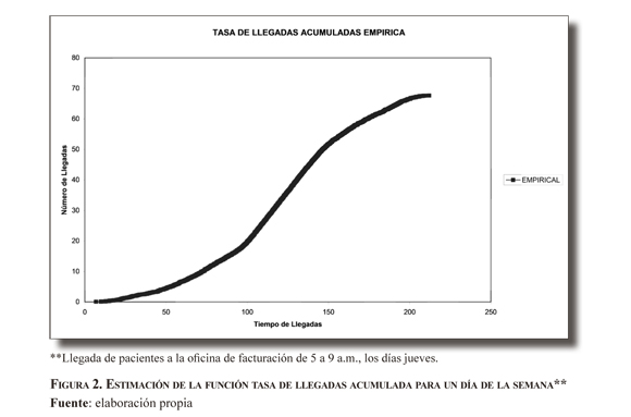 En la figura 2 se muestra la estimación de la función tasa de llegada acumulada para un día en estudio (jueves). En la expresión anterior m es el número de días, correspondientes al mismo día de la semana, cuyas funciones empíricas estimadas se agregan para obtener la función tasa de llegadas acumulada para ese día de la semana.