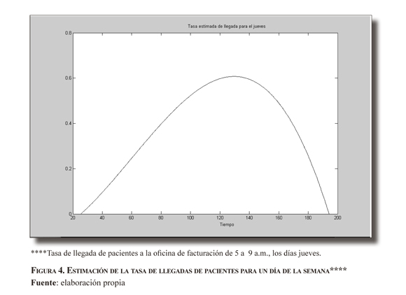Por lo tanto, la estimación de la función tasa de llegadas λ(t) para cada uno de los días de la semana, se obtuvo derivando la función Â(t ), tal y como se muestra uno de los días de estudio en la figura 4 y como se observa en las siguientes funciones: