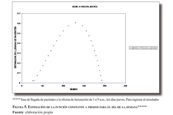 Para cada uno de los cinco días laborables de la semana se estimó un proceso de Poisson no homogéneo. El procedimiento para la estimación de la función tasa de llegadas λ(t) del proceso, a partir de los datos, sigue las siguientes etapas:
