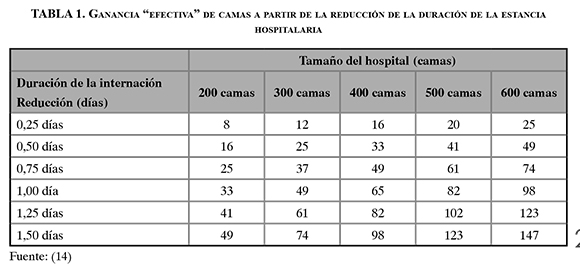 Ante esto, las instituciones de salud tienen la necesidad de reducir la estancia hospitalaria para aumentar el flujo de pacientes a través del logro de mayores niveles de eficiencia en la operación, sin afectar la calidad de la atención. Según el grupo de investigación de Advisory Board Company, los hospitales que logran reducir las estancias prolongadas de pacientes pueden agregar camas, aumentando así la capacidad efectiva (14), como se muestra en la tabla 1.