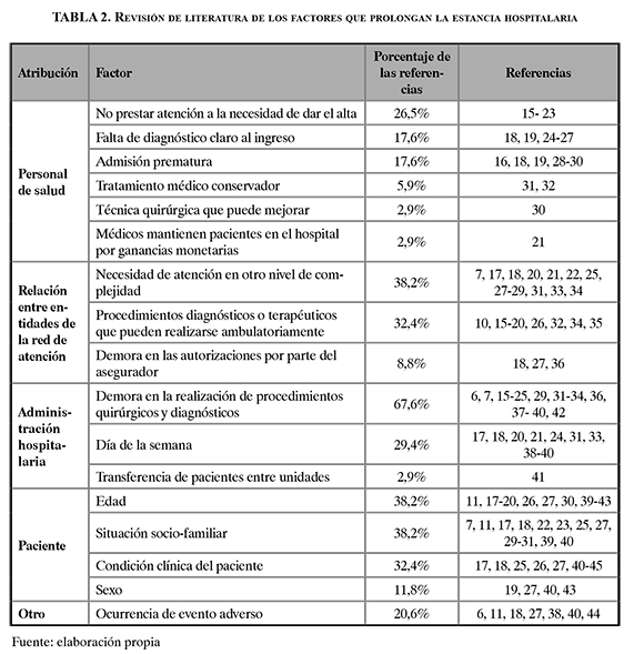 Según esta revisión, se concluye que el factor más frecuentemente encontrado en la literatura, que prolonga la estancia en los hospitales es la demora en la realización de procedimientos quirúrgicos y diagnósticos, seguido de la necesidad de atención en otro nivel de complejidad, de la situación socio-familiar y la edad del paciente.