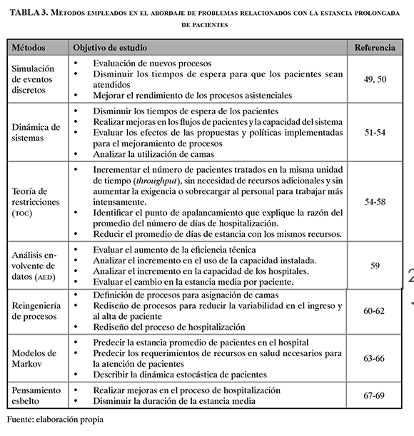 La revisión de la literatura permite identificar diferentes metodologías en el marco de la logística hospitalaria para entender y abordar los diferentes factores que prolongan la estancia y los efectos derivados de esta. Estas metodologías se encuentran orientadas a lograr mayores niveles de eficiencia en la administración hospitalaria, como son la simulación de eventos discretos, la dinámica de sistemas, el análisis envolvente de datos, la teoría de restricciones, los modelos de Markov, el pensamiento esbelto (lean thinking) y la reingeniería.