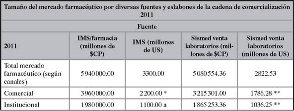 En este contexto, no se conoce con certeza el valor de mercado del sector farmacéutico. En efecto, según (IMS2), en 2011 el mercado privado en Colombia alcanzó los US$ 2,2 mil millones, al cual debe agregarse el valor del mercado institucional (que la firma estima en cerca del 50% del mercado comercial), para un total de US$ 3,3 mil millones. Pero la estimación de SISMED3, tomando el registro de ventas de los laboratorios farmacéuticos, asciende a US$ 2,8 mil millones.4 (Véase tabla 1)
