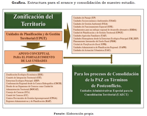 A continuación se identifican las unidades para la zonificación territorial y cuales para el apoyo y fortalecimiento y como ellas se pueden manejar en el proceso de Postconflicto. Para llegar al planteamiento unificado en la Unidad de Gestión y de Planificación Territorial que logre administrativamente plantear un desarrollo territorial y armonizar los distintos instrumentos de planificación además de fortalecer la participación de sectores, gremio y sociedad civil e integral la red de asentamientos poblacionales teniendo en cuenta fundamentalmente su jerarquización funcional y espacial.
