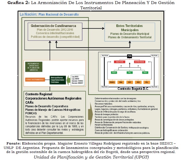 En la Figura siguiente., se identifican los contextos administrativos con algunos instrumentos, con los cuales se debe armonizar el territorio. Los UGPT, como instrumentos de gestión son cruciales para la toma de decisiones al articular los Planes de desarrollo y Planes de Ordenamiento territorial entre otros. Es de vital importancia el conocimiento y la valoración cualitativa y cuantitativa del territorio; se debe orientar a futuro y resaltar las limitaciones, establecer la capacidad de uso, la localización y detección de los bienes y servicios de que dispone o proporciona el territorio. Igualmente se debe incidir la dimensión social, ambiental, económica y administrativa, pues se considera que estas dimensiones éste influyen de manera importante para la toma de decisiones para la armonización de los distintos instrumentos de gestión. Tomado del trabajo de tesis de Magister Ernesto Villegas Rodríguez registrado en la base Sedici - Unlp DE Argentina (Villegas Rodriguez, 2014), Propuesta de lineamientos conceptuales y metodológicos para la planificación de la gestión sostenible de la cuenca hidrográfica del río Bogotá, desde una perspectiva regional.